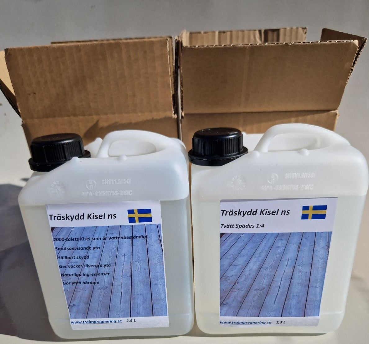 Träskydd Kisel ns och Kisel ns Tvätt i ett paket. Tvätten tar bort smutsen och gröna påväxten innan impregneringen, samt bidrar också till att impregnera er trall. Tvätten får ni i ett koncentrat som ni bara fyller på med vatten i dunken och skakar ett par gånger. Våra Produkter fyller ut håligheterna i träet med ett vattenbeständigt material. Trallen blir mera smutsavvisande och mycket lätt att tvätta av med vatten och borste bara. Naturliga ingredienser.